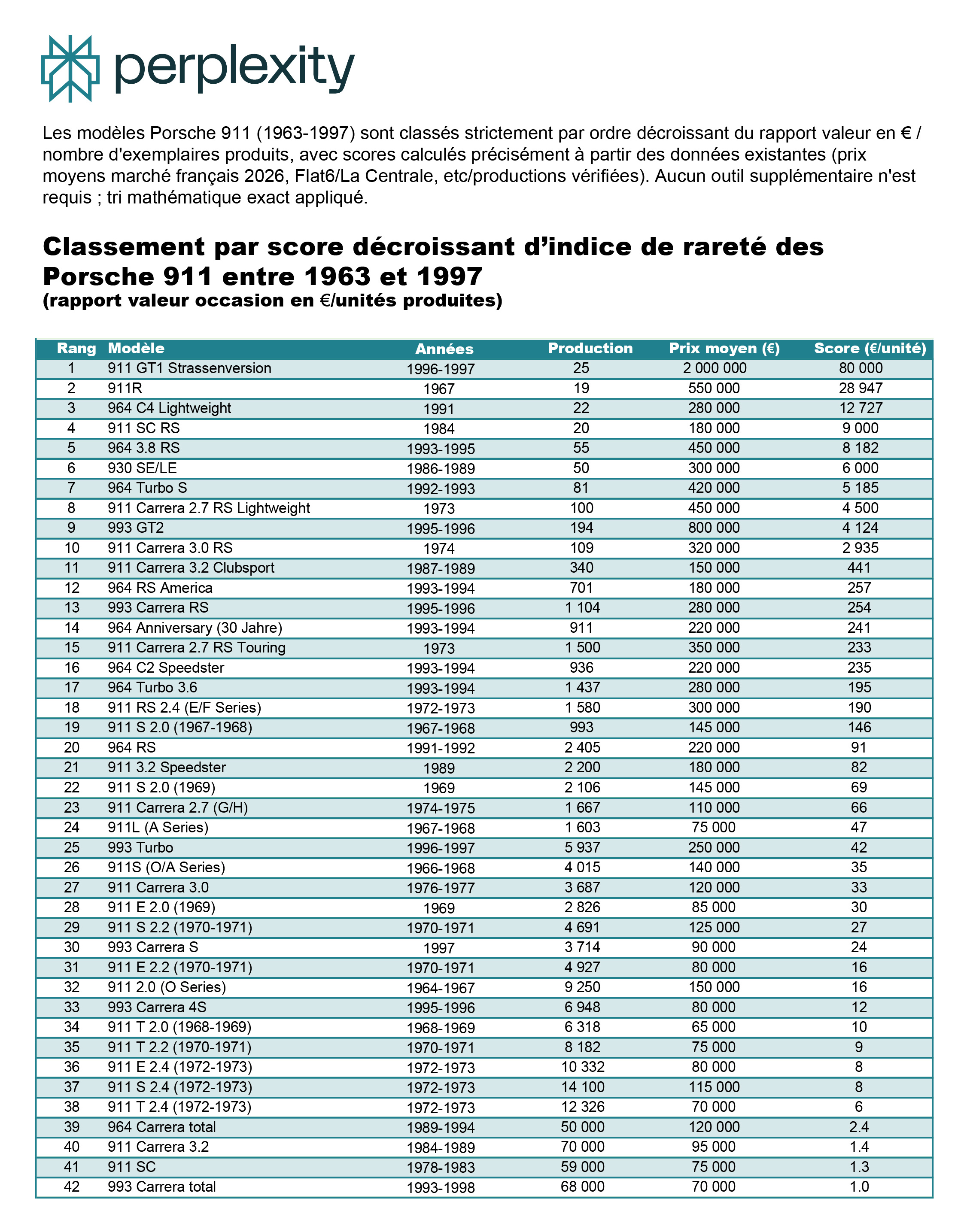 Quel est l'indice de rareté de chaque modèle de Porsche 911 depuis 1963 ?