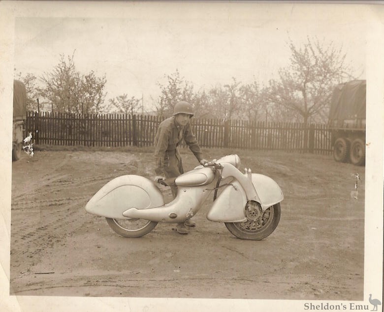 Ce qui frappe en premier lieu, c’est le carénage de l’engin. Puisant directement dans le style « streamliner », en plein essor dans l’industrie du rail à l’époque et caractérisé par une recherche d’aérodynamisme fondée sur des formes arrondies qui élimine au maximum les angles et les arrêtes, la configuration retenue ici est celle d’un cadre monobloc tubulaire, entièrement recouvert d'une fine couche de tôle qui couvre les roues avant et arrière et le réservoir d'essence. La règle graphique consiste à présenter de larges courbes au contact frontal de l’air et de finir en pointe dans la queue du déplacement, comme la silhouette d’une goutte d’eau. Il en résulte une allure général sobre et compacte, élégante, sculpturale et délicieusement surannée aujourd’hui.
